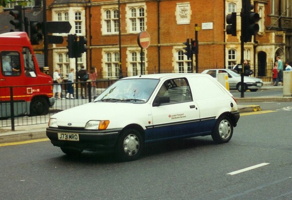 | Details: The diminutive Ford Fiesta van looked smart in the new LUL livery, although only 8 are known to have carried this. The first was 4101F (J731MRO), new in August 1991. It was found passing Victoria Coach Station on 6th September 1993. | |||