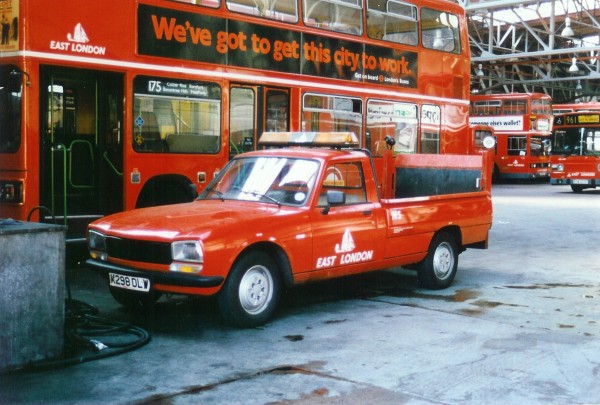 | Details: A batch of five Peugeot 504 pick-ups was leased in October 1992 for use by bus garages in East London. Unusually for vehicles of this size, most were fitted with tail-lifts. 4205P (K298OLW) was based at North Street Garage, Romford, where it was photographed on the 19th of March 1993. It carries the sailing barge logo of the East London bus operating unit, although these were later changed to Stagecoach logos. Note also the spot-lights mounted on the rear corner posts. | ||||