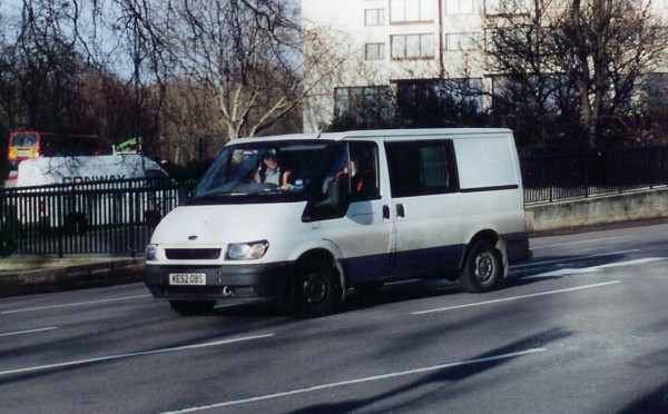 | Details: This low-roof, short wheelbase Ford Transit appears to be a crew van, judging by the extra side window, although this is not always a reliable indicator. What can be said is that most Transits with this feature are of the longer and taller versions. 5387F (KE52OBS) was seen at Hyde Park Corner on 15th January 2004, at which time it appeared to still be carrying LUL lettering. | |||