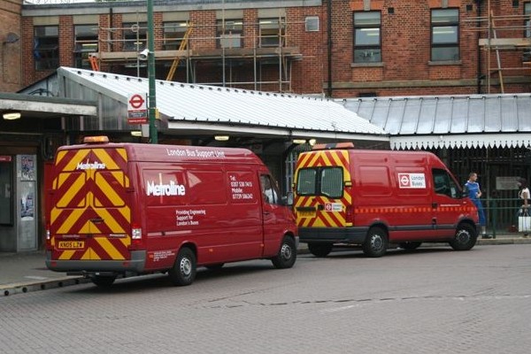 | Details: Another view of Metroline's then new Mercedes-Benz Sprinter van KN05LZW at Golders Green on 9th September 2005 allows a comparison with LBSL Vauxhall Movano 5207V. Note the similarity of the liveries. | |||||