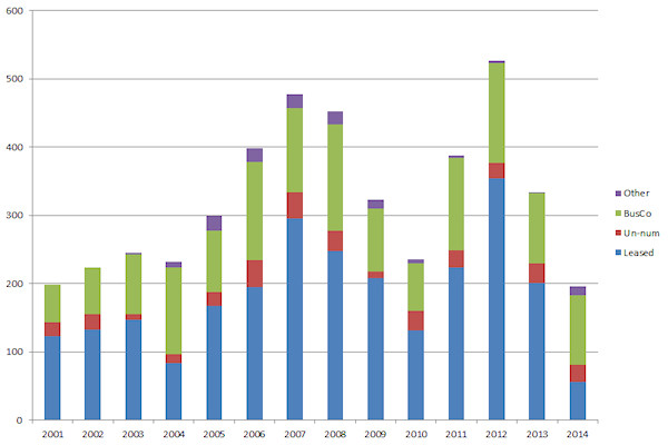 | Fleet intake graph 2001-2014 I forgot to add this graph which shows the (approximate) number of vehicles added to each segment of the fleet for the years 2001 to 2014. The relatively low number of vehicles added in 2014 is apparent, particularly for the central fleet (shown as Leased or Un-num). The previous dip in 2010 can also be seen. ![]() | Tue 27/01/2015, 14:04 |