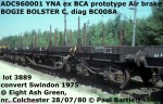 The Bogie Bolster C was the most numerous Bogie Bolster type built by BR, a total of 5691 being built between 1949 and 1962. All were 45ft long over headstocks with a carrying capacity of 30tons, and the final 1400 were built with vacuum brakes. Under lot number 3889, two wagons were rebuilt at BR Swindon in 1975 being fitted with Y25C bogies and air brakes. When complete, they were numbered in the air-braked series (as 960000 and 960001) and given the TOPS code of BCA (design code BC008A). For some reason, the design was not deemed successful and both wagons were transferred to the departmental fleet (as YVAs to design code YV060A) before premature withdrawal in 1983.