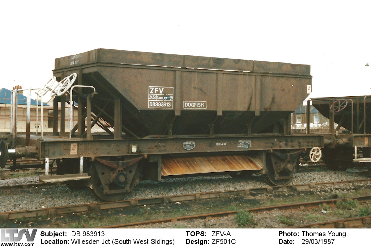 Design/Diagram: 1/586 19t Hopper Ballast Wagon (Catfish) Design/Diagram: 1/587 24t Hopper Ballast Wagon (Dogfish) Design/Diagram: 1/588 24t Hopper Ballast Wagon (for Slag Ballast) (Dogfish) Fishkind: Dogfish ZFV Ballast Hopper Fishkind: Mer-Dog ZFV Ballast Hopper Fishkind: Catfish ZEV Ballast Hopper TOPS Class/Code: ZCV Ballast/Sleeper TOPS Class/Code: ZEV Ballast Hopper, centre chutes, 'Catfish' TOPS Class/Code: ZFV Ballast Hopper, centre & side chutes, 'Dogfish' TOPS Class/Code: ZFW Ballast Hopper, centre & side chutes, 'Dogfish' TOPS Class/Code: ZSV Runner/Barrier |