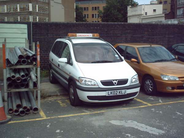 Details: Another picture taken at Edgware Road Station on 19th July 2003, and again something new! 5318V (LK02KLJ) is a Vauxhall Zafira and features additional emergency-vehicle-style striping on standard livery, plus a roof mounted light bar. |