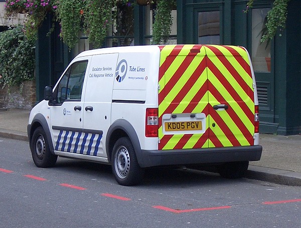 Details: At least two Ford Transit Connect vans appeared in this new livery in Autumn 2005. 5689F seen outside Griffith House on 2nd October 2005 displays the Escalator Services lettering and variation on the blue skirt livery. The other vehicle reported was 5688F. |