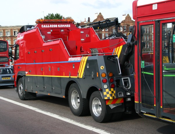 Details: Another fine view of Volvo VLT46 shows it in action on Putney Bridge on 4th August 2005. Note the back axle is in the lowered position. I noticed too late the black hydraulic arm at the top. This actually belongs to another lorry in the next lane! |