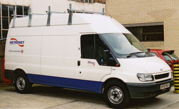 Details: Ford Transit vans continued to dominate the service vehicle fleet into the 2000s. New in Spring 2005, this is 5739F at Ealing Common Depot. Branded for Metronet SSL, it is a high-roof Transit 90 T350 van with roof racks. This picture also answers the question of why these vans have a seam below the roof-line. |