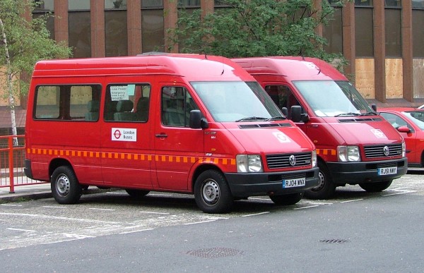 Details: These VW LT35 minibuses seen at Aldgate Bus Station on 6th October 2005 have been illustrated before but this picture was selected as it shows the slight difference in colour between the two. 5281VW on the right was new in February 2002 in a darker shade of red than standard and has been allocated to Aldgate ever since. Unique for over 2 years, a further four similar vehicles joined it in July 2004, including 5614VW seen here. Although very similar to Mercedes-Benz Sprinters, the tall headlamps of the VW LT-series make recognition easier. |