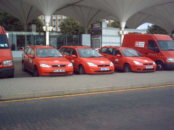 Details: Stratford Bus Station on 19th July 2003, with a line-up of 3 cars sandwiched between two Vauxhall Movanos. From left to right these are 5106V (W236XEB), a Vauxhall Astra estate, 5290F (VK51YYB), a Ford Focus estate, and 5293F (VE51FLK), another Ford Focus estate, although of a slightly different model. |