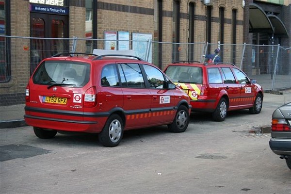 Details: Regular residents of Finsbury Park Bus Station, Vauxhall Zafira 5565V and un-numbered VW Golf estate GJ54KTG were present as usual on 1st October 2005. Note that the Golf carries chevrons on its rear. |