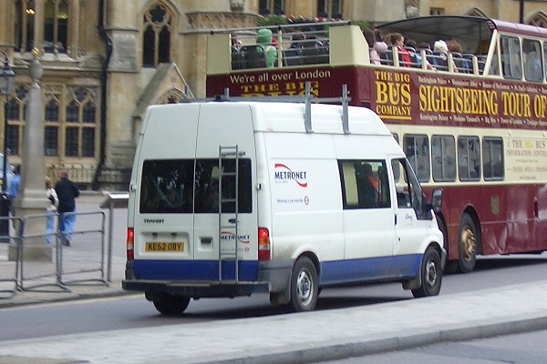 Details: High-roof Ford Transit 5382F caught me by surprise in Westminster on 2nd July 2005. This picture has been included as it shows the rear ladder arrangement and a less capacious roof rack than normal. This is one of several Transits to have had an additional offside window added after entering service. |