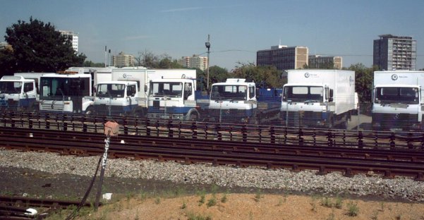 Details: Acton Town yard again, viewed from a District Line train on 3rd August 2003. The Mercedes-Benz and Iveco trucks seen here are typical of the owned fleet, examples of flatbeds and demountables being visible. Towards the left is one of the Mercedes-Benz Econic dustcarts. |