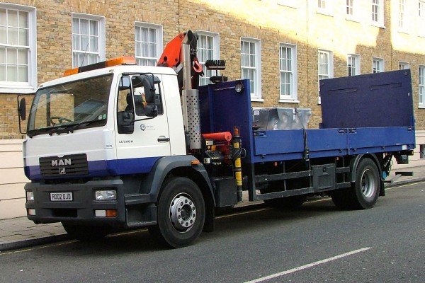 Details: MAN truck 2579 has been resident at Griffith House since August 2002 but has proved hard to photograph. John found it out in the open for a change, parked on Allsop Place behind Baker Street Station on 15th November 2005, carrying what looks like a pair of escalator steps. Note the large tail-lift specified for vehicles used by the lifts & escalators department. |