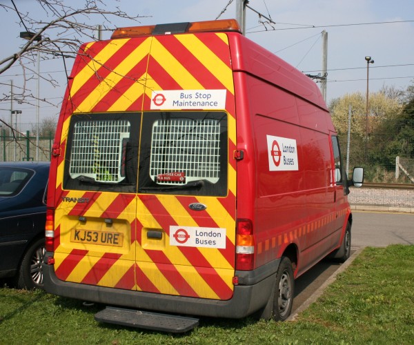 Details: Of the 12 Ford Transits leased for London Buses in Winter 2003/4 (5578F-5589F), this is the last to be illustrated on the site. 5586F spent several months based at the Croydon Tramlink depot at Therapia Lane, for reasons unknown. Fortunately, Damon managed to poke his camera through the fence on 28th March 2005 and record this image. More recently, 5586F has been seen working in central London. |