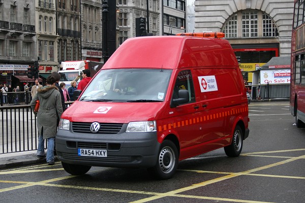 Details: Delivery of a new batch of VW Transporter vans for London Buses started in early 2005, these differing from earlier examples in being of the high-roof variant. The number range 5668-5678 appears to have been intended but, as of late 2005, only 7 had been reported, plus 3 others that carried no numbers. One of the most visible of the batch is Victoria-based 5675VW, seen here rounding Piccadilly Circus on 27th April 2005. |