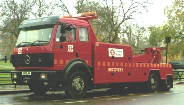 Details: A surprise appearance in December 2005 was Mercedes-Benz tow-truck L100JMH in full London Buses livery. The exact details of its ownership are not yet known but it is believed to be operated by a contractor such as Sovereign. It was seen at Park Lane soon afterwards. |