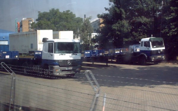 Details: A pair of Mercedes-Benz tractor units in the yard at Acton Town on 9th August 2003. On the left is 2560M (R962RBY), an Actros 1835LS new in 1998. On the right is 2551M (M25DLN), the only 3-axle tractor in the fleet. A selection of trailers can be seen in the background. |