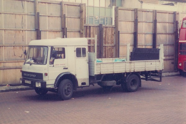 Details: The yard alongside Victoria bus garage was often host to visitors, including service vehicles, trainer buses and long distance coaches. This typical 1980s view shows Bedford TL dropside 2271B taking a rest, perhaps while its crew make use of the canteen. The TL crew-cab was slightly odd, with a sloping roof and tapering sides with full-height rear doors. |