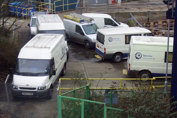 Details: Very little of LUL's Lillie Bridge depot is visible to the public, either from trains or elsewhere. However, this small yard literally on top of the District line tracks can be seen from the Cromwell Road fly-over. Parked there on 22nd February 2006 were a variety of vans including 5353F (KE02YUW) nearest the camera. The other two mid-height vans are similarly numbered 5352F and 5354F, while the low-roof example is 5366F. It can just be seen that all these Transits have had offside windows added, a modification that has affected a growing number of similar vans. The step below the rear doors also appears to be a recent addition. Beyond these are three of the smaller Transit Connect vans, including new 5858F in white and blue. The other pair were in an unmarked silver livery and the regs are believed to be KJ03OVK and KE05MFF. The status of these is unknown, although it is notable that both have small roof racks. |