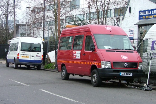 Details: There aren't very many locations where you can see LUL and LBSL service vehicles together, and this example was more by chance than anything. VW LT minibus 5281VW was taking a break from its duties at Aldgate Bus Station to have its front nearside wheel attended to. Work such as this is sometimes carried out at the garage on Bollo Lane, close to Acton Town station. In the background is Metronet Ford Transit Minibus 5715F. 22nd February 2006. Please note this is not a prototype for a planned fleet of 3-wheeled minibuses! |