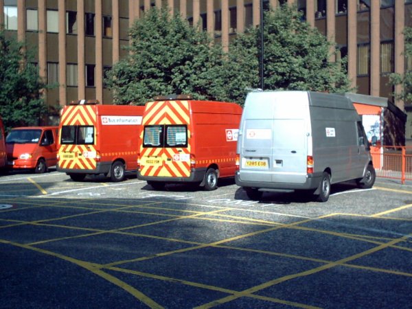 Details: A trio of Transit vans at Aldgate Bus Station, each one different. To the left is 5040F (X188GBH) which acts as a control unit and information office. 5339F (KE02YSM) is a standard high-roof van, while silver Y285EOB was acquired in May 2001 but carries neither a fleetnumber nor standard livery. 9th August 2003. |