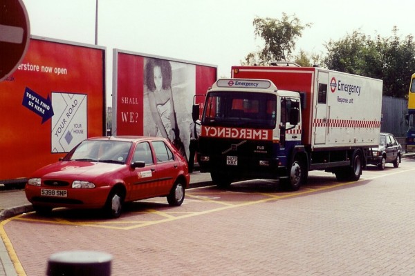 Details: Little and large at Edgware Bus Station, as resident Ford Fiesta car 4882F is accompanied by ERU Volvo demountable 2570V. Both vehicles entered service in late 1998. |