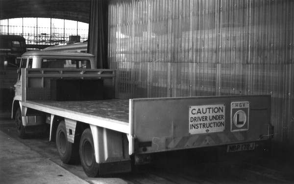 Details: Stockwell Garage was a major maintenance base for the service vehicle fleet and many unusual types could be seen visiting from time to time. A good example is this view of Bedford TK flatbed 1866B, taken probably in the late 1970s. This vehicle was unlike most other SVs in being a six-wheeler, and a flatbed. It was also one of very few lorries acquired second hand, being bought in 1974 specifically for driver training duties. As such, it was normally to be found in Chiswick works. |
