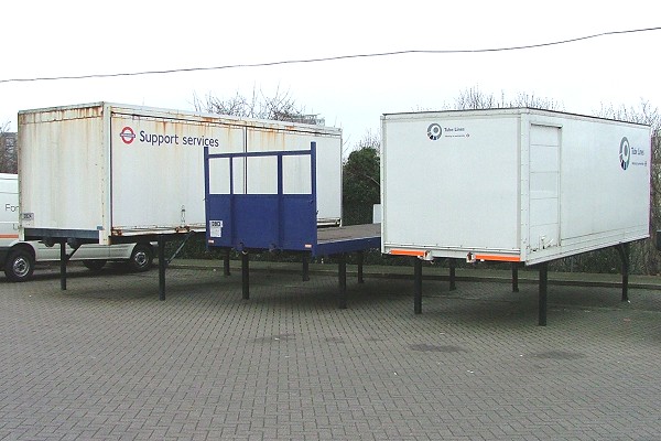 Details: The use of demountable bodies is an important aspect of the modern service vehicle fleet, but they are rarely seen on their own. As this picture shows, all are fitted with retractable legs making them free-standing. The lorry chassis are then simply driven underneath. This view at Acton Works on 22nd February 2006 shows three 'naked' bodies. On the left is DB24 built by Feltham Coachworks in 1996. Although the newest body in the fleet, it sees little use, as evidenced by its condition and out-dated lettering. It is also larger than most demountables and is believed to only be suitable for carrying by Ivecos 2554F and 2555F. In the centre is DB13 built by Locomotors. Although apparently delivered as a dropside, it had by then become a flatbed. On the right is DB20, again by Feltham but to the more normal size, and fitted with a door on the nearside only. With permission of Tube Lines |