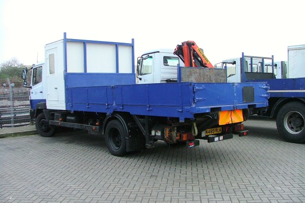 Details: At least three of the demountable bodies built by Locomotors in 1993 have this combination of dropsides and a small crew compartment. This picture shows DB18 mounted on Mercedes-Benz 2509M in the lorry yard at Acton Works on 22nd February 2006. The side-hinged rear doors of the body are designed to clear a tail-lift, and it would appear that this lorry does have a fold-under lift fitted. A slightly odd aspect of this lorry is that what looks like a wheelarch on the body does not line up with the wheels. It is also mysterious why a blue skirt is not applied to the crew compartment. Note that the grey panel above the rear doors is in fact the headboard of crane-equipped Mercedes-Benz flatbed 2553M alongside. With permission of Tube Lines |
