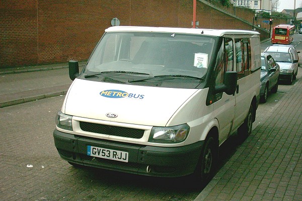 Details: Metrobus service vehicles are regular visitors to Eltham Bus Station as in this view of Ford Transit Crew Van GV53RJJ on 14th March 2006. Although this is officially allocated the fleet number 8004, the only number carried is a small 4 in the windscreen. The notice behind the tax disc reads 'Spare Ferry Bus'. |