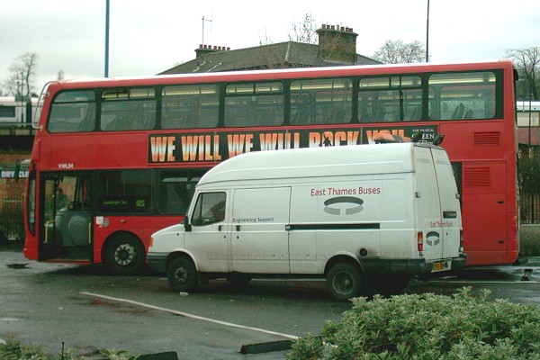 Details: An elusive SV has been East Thames Buses LDV Convoy van S356RDP, often seen from passing trains at Lewisham Bus Station but un-photographed until now. Ray did the honours on 24th March 2006, when it was parked next to one of East Thames' VWL buses. The livery of the van appears to include the remains of some striping (rather like the orange squares applied to LBSL SVs), perhaps from its former operator. |