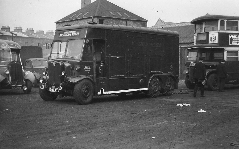 Details: An extensive rebuild in the late 1930s transformed four LS-class buses into 9-ton breakdown tenders. 222U was seen at its home base of Camberwell, the white edging to the bottom indicating that the picture was taken during or shortly after WWII. Note the chains fitted to the rear wheels. |