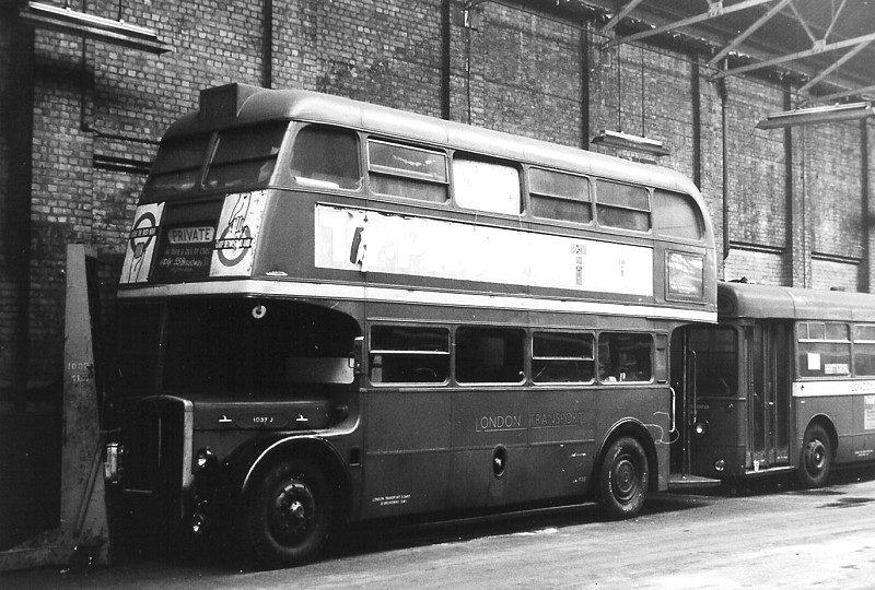 Details: This picture, probably taken in West Ham Garage some time during the 1970s, shows AEC Regent mobile instruction bus 1037J parked out of use. The complicated history of this vehicles chassis and body are explained in the Capital Transport service vehicle book. |