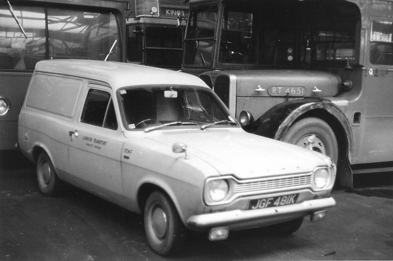 Details: Snuggling up to some RT and DMS buses at its home garage of Camberwell, Ford Escort van 1704F was new in August 1971. Escort and similar sized vans delivered from the next year carried red livery instead of the grey seen here. |