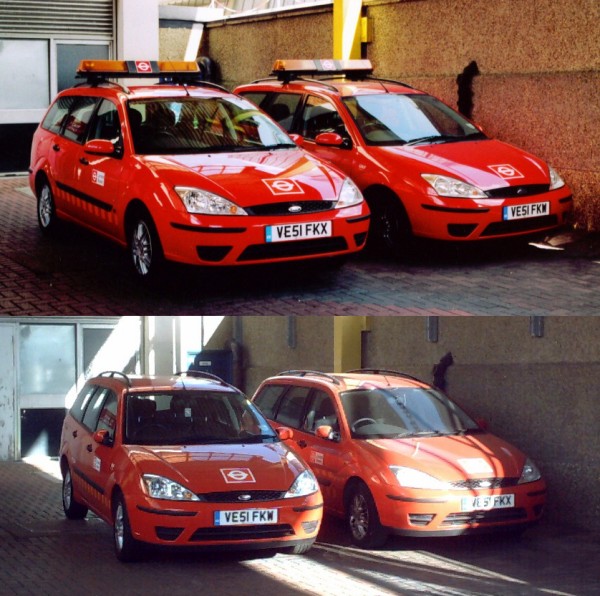 Details: Two Ford Focus estate cars seen on different occasions at Uxbridge bus station. Apart from the reversed positions, and the lighting, the difference between these two shots is that in the upper view, detachable light-bars have been fitted. The cars are 1.8LX TDi models numbered 5292F (VE51FKW) and 5295F (VE51FKX). |