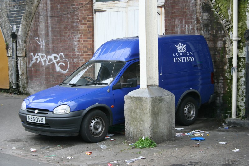 Details: There is always something in the way! Parked under the railway at Shepherds Bush Garage on 18th April 2006, N86GVX was a previously unreported London United SV, being based on the original design of Vauxhall Combo. The blue livery was presumably retained from its previous owner, although full lettering has been applied. Numbered S3 (on the offside only), the numbers S1 and S2 had been applied to the other two SVs allocated here. It is worth recording that the London United name looked set to disappear later that month, with most of the buses being rebranded as Transdev (the owning company). It is a shame that the attractive logo seen here may soon become history. |