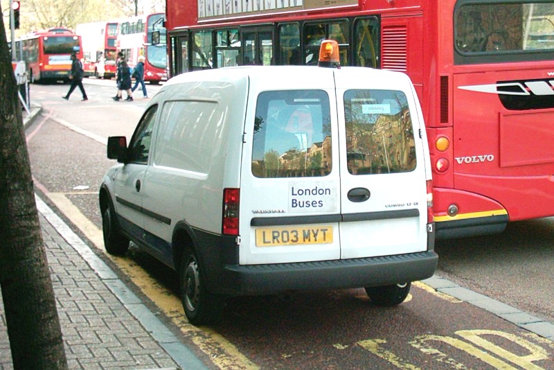 Details: Another view of one of the oddities in the fleet. This Vauxhall Combo van has been used by London Buses since new, although it carries London Underground livery (the blue skirt is standard though barely visible here). Stranger still, the only permanent lettering carried is the fleetnumber 5450V, but this is officially claimed by similar van LN03XAJ! Also odd is that it was seen at Elephant and Castle on 2nd May 2006 attending to roadside ticket machines, a role previously only observed being performed by vehicles of contractor Almex. |