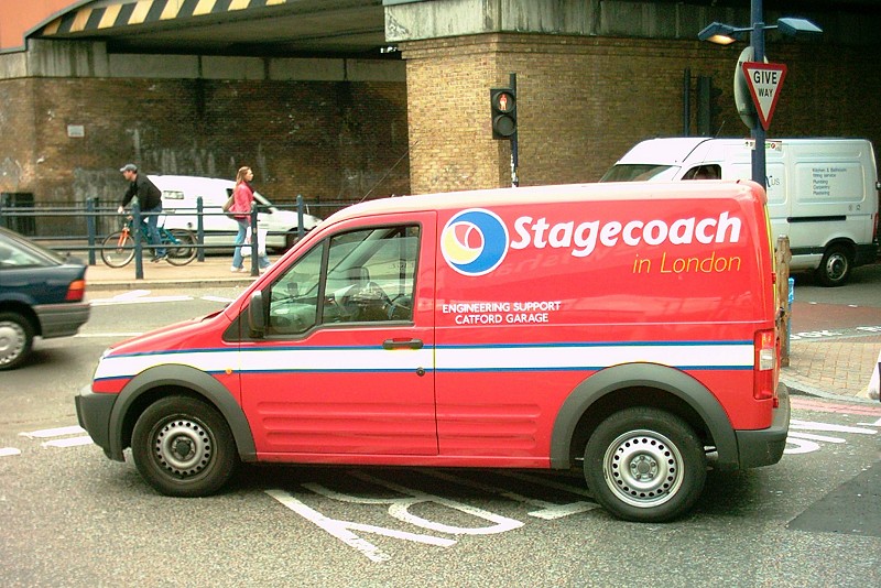Details: The new engineering support van based at Catford outdoes even the Bow and Upton Park examples illustrated earlier, at least in terms of the size of its logo! This side-on view of HT05UZX leaving Lewisham Bus Station on 2nd May 2006 shows the reflective qualities of the yellow side stripe. |