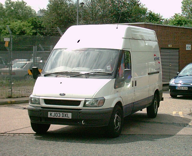 Details: Glinting in the sun as it leaves Acton Works on 25th May 2006, 5439F is a relatively rare example of a high-roof Ford Transit van in LUL-related use. The car park to the left is mainly used by staff but sometimes contains a couple of service vehicles. |