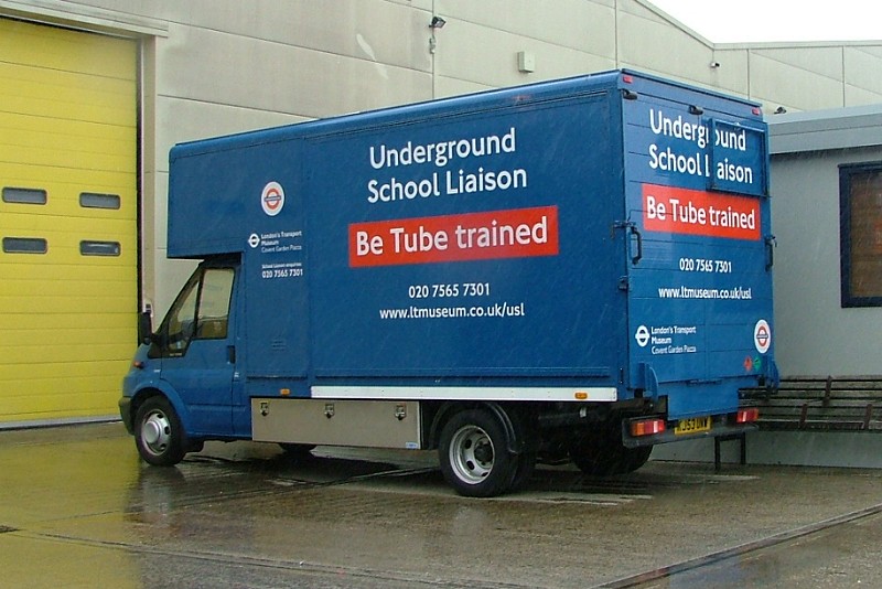 Details: Ford Transit exhibition unit 5494F is instantly recognisable by its livery and Luton-type bodywork. On 27th May 2006 it was getting wet outside the Museum Depot in Acton. |