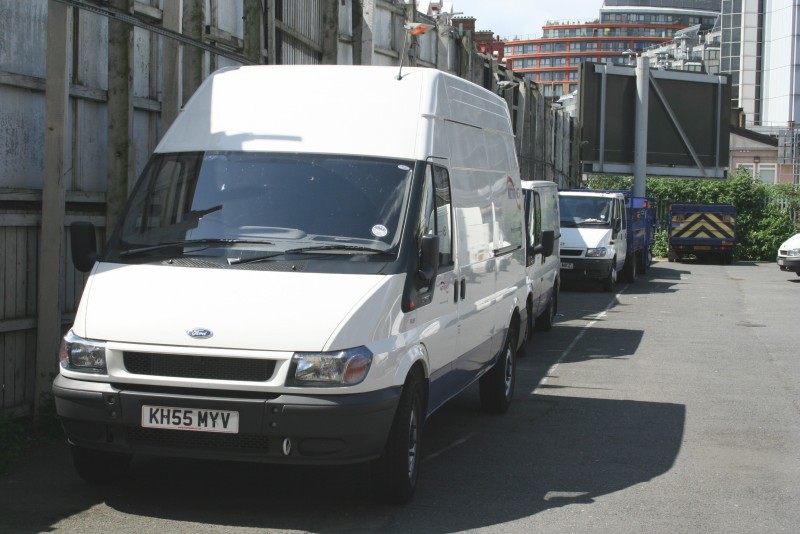Details: Apart from 3 Volkswagen Transporter vans for London Buses, the only service vehicle reported with a number over 6000 by June 2006 was Ford Transit 6028F, seen here at Griffith House on 29th May. This Metronet-liveried vehicle has a high-roof van body, and this is evident when compared to low-roof Transit 5239F parked behind. Also visible are several Transit dropside trucks, including 5700F, 5888F and 5154F. |
