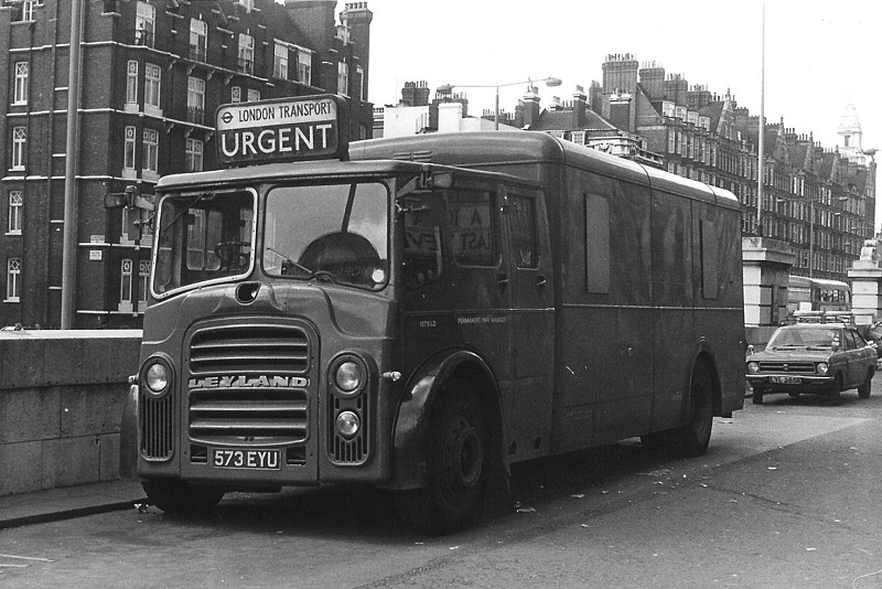 Details: The nine Leyland Titan railway breakdown tenders bought in the 1960s were distinctive (some might say ugly!) vehicles, with bus fronts and boxy bodies. 1275LD was often based at Baker Street Station, as in this view taken on 9th April 1977. The advert frames on the bodysides were not used a great deal. Note the prominent indicator brackets. |
