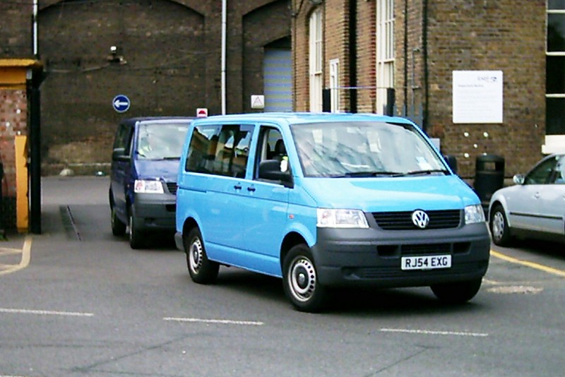 Details: Here are some more service vehicles that look anything but. Leaving the Kings Cross depot of Metroline on 20th June 2006, these two VW Transporter minibuses are in fact used in the crew ferry role. Light blue RJ54EXG leads dark blue RF54MTO. |