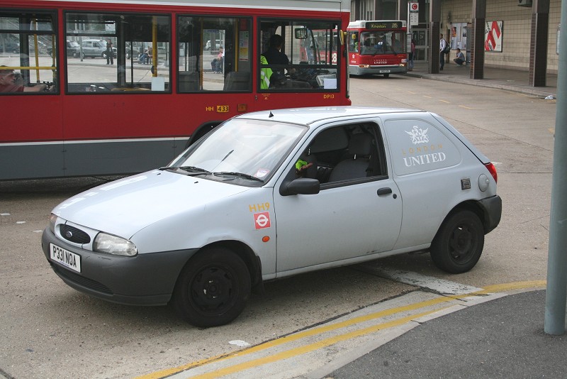 Details: London United seem to like using ex-BT vehicles, and many retain their grey livery. A typical example is HH9 (P331NOA), seen at Hatton Cross Station on 13th June 2006. As the fleetnumber suggests, this is used as a crew ferry vehicle from the Hounslow Heath depot inherited from Westlink. The HH code also appears on the bus in the background. Note how the yellow transfers are ideal against red but not so great on light grey! |