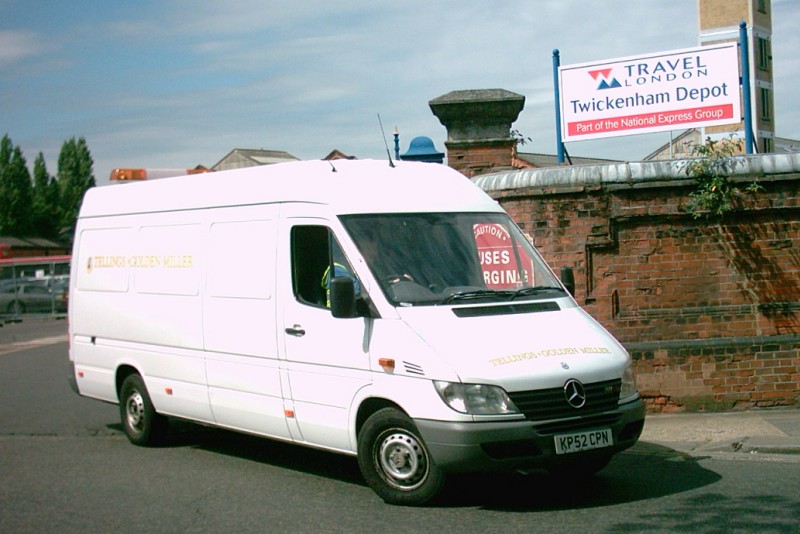 Details: Now this is a bit of a puzzle. Travel London took over the bus operations of Tellings Golden-Miller in June 2005 and were fairly quick to replace the fleetnames on vehicles. So this vehicle leaving the Twickenham (formerly Fulwell) depot on 28th June 2006 is a bit of an anomaly. Perhaps Mercedes-Benz Sprinter van KP52CPN is actually operated by the coaching remains of TGM, some of which are believed to have operated from Fulwell after the take-over. Can anyone provide more info? |