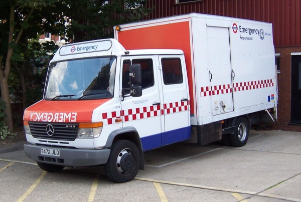 Details: The vehicles operated by the Emergency Response unit are outstationed at strategically placed locations to enable rapid access to incidents on any part of the underground network. Seen at the small Camden depot in October 2003 is 2572M (T472JLD), one of the four Mercedes-Benz 814D box vans with crew cab and tail lift that were purchased in 1999. The livery is significantly modified to make the vehicles more conspicuous to other road users. |