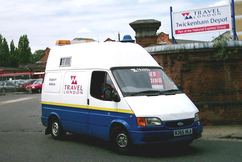Details: TGM operated two of these camper-van looking Ford Transits, being based on high-roof, short-wheelbase models with additional ''sleeper'' windows. At least N365HLA survived to be taken over by Travel London and it was seen at their Twickenham base on 28th June 2006, still carrying TGM white/blue/yellow livery. It is not known when the fleetnumber (13 on the bumper) was added. Note that the blue dome is in fact part of the depot gates. |
