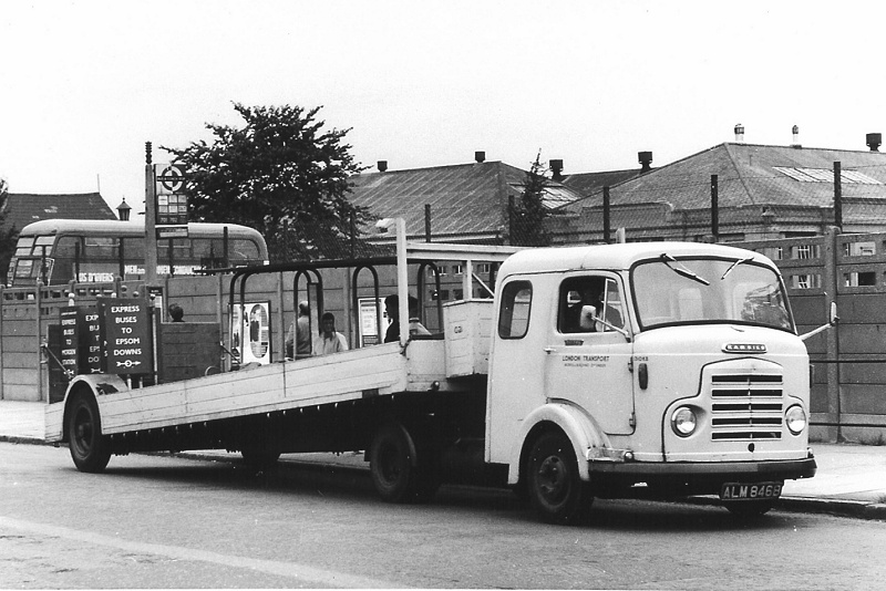 Details: Although this picture has been published elsewhere it is interesting for showing what was a unique combination in the London Transport Service Vehicle fleet. 1310KB was a Karrier Bantam prime mover bought in 1964 and habitually used, as here, with Carrimore shelter carrying semi-trailer C21. The mismatched-looking pair lasted until 1972, after which their role was performed by King semi-trailer K1 and one of several Ford D-series prime movers. Just two other Karriers were bought by London Transport, although 10 were inherited from or ordered by the LCCT prior to 1933. The other pair were both battery lorries, comprising Bantam 1303KB and larger Gamecock 1404KG. When seen outside Chiswick Works on 14th September 1966, 1310KB appears to have been used for the slightly less arduous duty of shifting signs used at the Epsom Derby. Reproduced by kind permission of Alan Cross. Copyright. |