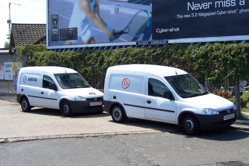 Details: A pair of Arriva Vauxhall Combo vans parked outside the Barking operating centre on 8th August 2006 show some variations in the liveries. The rear vehicle, with blue logo and large fleetnumber, is a crew ferry van. The one in front has an orange logo and no lettering, and is thought to be an engineering department vehicle. |
