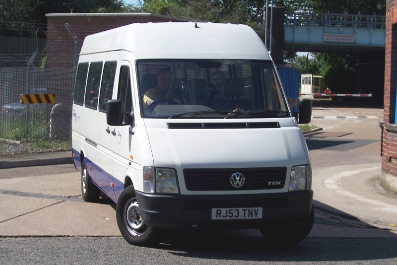 Details: Ray's final picture from his 25th August 2006 visit to Bollo Lane was of yet another interesting vehicle. 5534VW was a 15-seat Volkswagen LT35 minibus acquired in late 2003 and reportedly based at the Central Line depot at Hainault. Unique in carrying LUL livery, several similar minibuses have been taken in red. 5281VW and 5613-5616VW are based on the shorter model (with two side windows instead of three), while Aldgate-based RO06OAG and RO06OAH have three windows but lack the offside access door. |